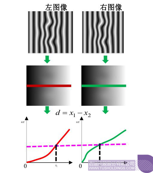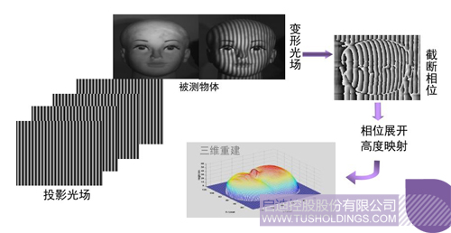結(jié)構(gòu)光條紋(單幀條紋或相移條紋)投影到被測物體表面,從另一方向觀察到變形條紋,通過計算變形條紋的相位,得到截斷相位,展開成連續(xù)相位,根據(jù)相位和高度的映射關(guān)系,重建被測物體的三維面形數(shù)據(jù)。