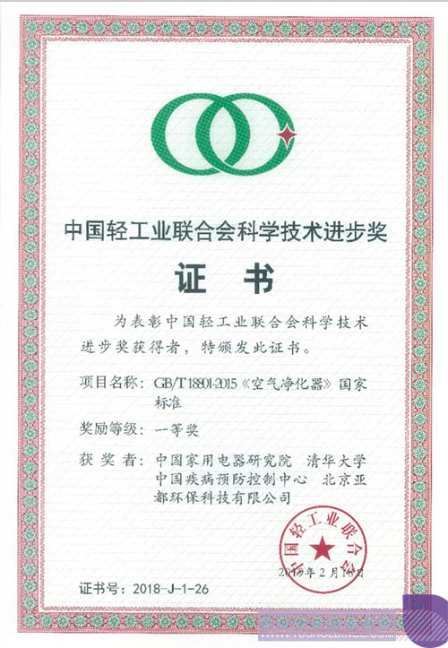 3月21日,中國輕工業(yè)聯(lián)合會四屆五次理事會在廣西南寧舉行。會議表彰了2018年度中國輕工業(yè)聯(lián)合會科學技術獎的獲獎組織和個人,由啟迪控股成員企業(yè)—亞都、中國家電研究院、清華大學、中國疾控中心聯(lián)合起草制定的“GB/T18801-2015《空氣凈化器》國家標準”項目榮獲2018年度中國輕工業(yè)聯(lián)合會科學技術進步一等獎,亞都作為該標準的主要起草單位,成為唯一獲得此項獎勵的企業(yè)單位。
