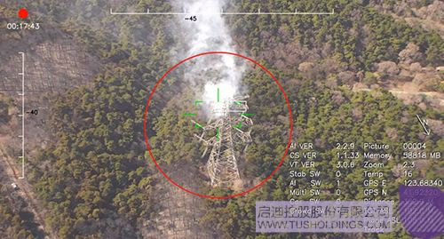 沈陽棋盤山火場,3V復(fù)合翼無人機搭載三軸30倍光電吊艙巡查到一個火點已經(jīng)威脅到高壓線的安全
