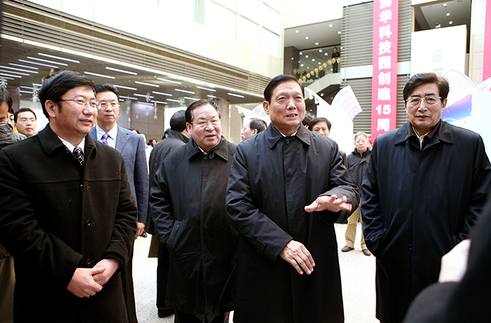 2009年,時(shí)任中央政治局委員、北京市委書記劉淇、時(shí)任北京市市長(zhǎng)郭金龍參觀清華科技園創(chuàng)建十五周年成就展。