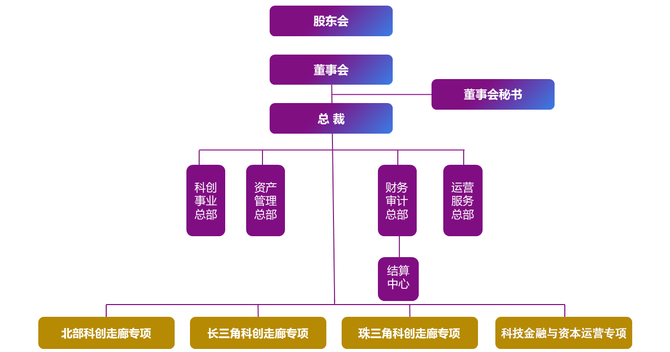 四個總部:科創(chuàng)事業(yè)總部、資產管理總部、財務審計總部、運營服務總部四個業(yè)務專項:北部科創(chuàng)走廊專項、長三角科創(chuàng)走廊專項、珠三角科創(chuàng)走廊專項、科技金融與資本運營專項
