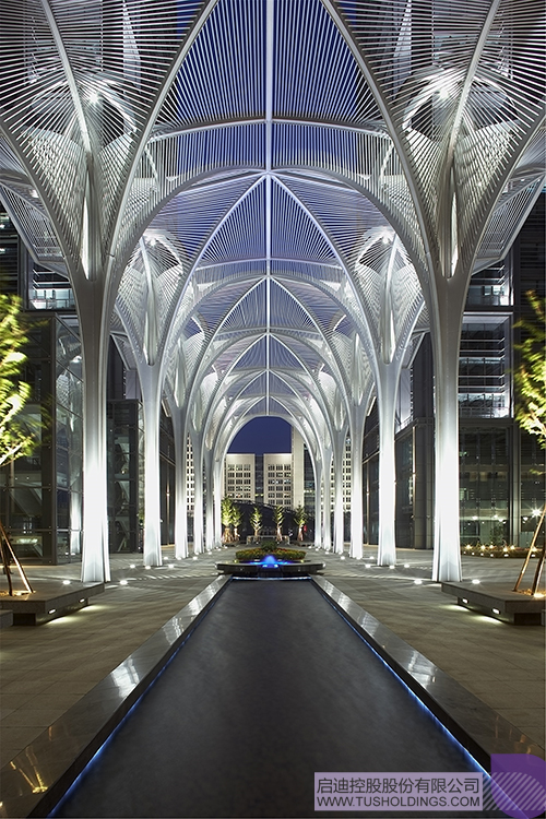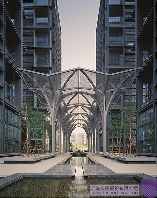分列的四塔間隙為城市道路通向園區(qū)中心綠地打開了一條綠色通廊,中心是12顆參天鋼樹,形成灰空間的限定,與二層平臺(tái)自然的樹木共同營(yíng)造出積極的公共交往空間?!皹溆捌沛丁毕率蔷G意盎然的休閑廣場(chǎng),展現(xiàn)人與自然共生共融的景象。建筑首層斜插入地下的草坪,標(biāo)準(zhǔn)層四角的綠色陽臺(tái)和頂層白色膜傘的屋頂花園無不體現(xiàn)了人性化、生態(tài)化的現(xiàn)代商務(wù)辦公理念。