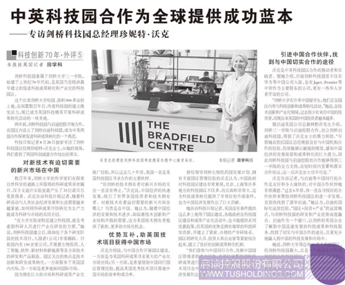 科技日?qǐng)?bào)記者8月28日獨(dú)家專訪了劍橋科技園總經(jīng)理珍妮特·沃克女士,從她的視角,我們看到了兩國(guó)科創(chuàng)誠(chéng)意合作結(jié)出的果實(shí)。