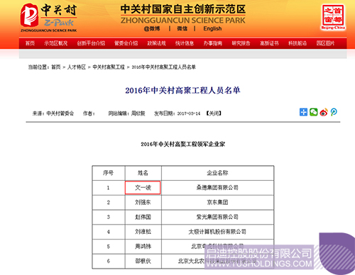 啟迪桑德董事長(zhǎng)文一波入選“2016年中關(guān)村高聚工程領(lǐng)軍企業(yè)家”打印
