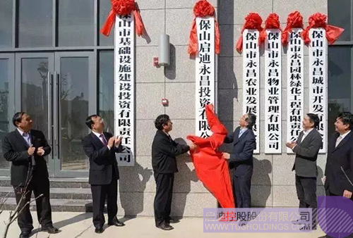 姜?jiǎng)僖ㄓ胰┡c趙德光(左三)共同為保山啟迪永昌投資有限公司揭牌