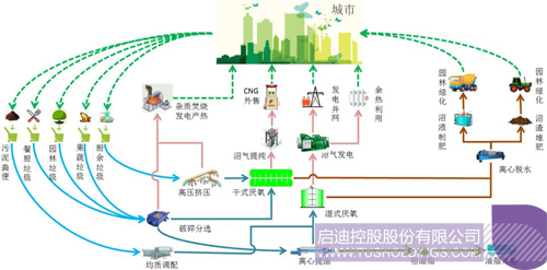 啟迪桑德針對(duì)各類城市濕垃圾的特點(diǎn),成功的開發(fā)了“垃圾干濕分離”、“干法/濕法厭氧”、“沼渣處理”、“沼氣凈化與利用”、“沼液處理”等多項(xiàng)核心技術(shù),建立了城市濕垃圾處置與資源化利用綜合解決方案。通過處理,城市濕垃圾能夠被轉(zhuǎn)化為沼氣、沼渣、沼液和殘?jiān)葞追N產(chǎn)品。沼氣可作為清潔能源被廣泛利用,如制取壓縮天然氣、熱電聯(lián)產(chǎn)或作為直接作為燃?xì)獾?。沼渣和沼液可以作為有機(jī)肥,回用于市政綠地及園林。殘?jiān)赏馑屠贌龔S處置,產(chǎn)生電能。
