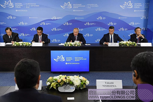 9月11日,俄羅斯第四屆東方經(jīng)濟論壇在遠東城市符拉迪沃斯托克舉辦。當日下午,由論壇主辦方邀請的中外企業(yè)家代表參加了與普京總統(tǒng)的座談會。王濟武董事長應邀出席,并與其他五位中外企業(yè)家在座談會上發(fā)言。